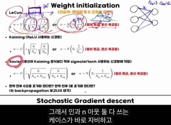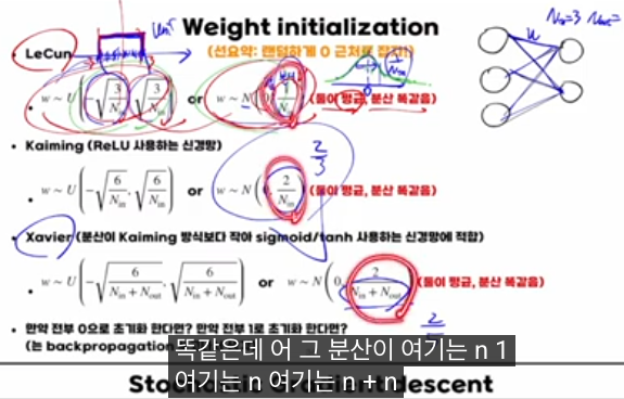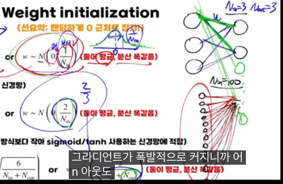 이 강의의 핵심은 “웨이트 초기화는 ‘0 근처의 작은 랜덤값’으로 하되, fan_in / fan_out(입·출력 노드 수)에 맞춰 분산을 잘 잡아야 앞으로도, 뒤로도 신호·그라디언트가 폭주하거나 사라지지 않고 안정적으로 전파된다”는 점입니다.