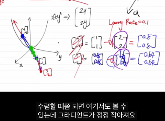 형태이며, 여기서 α는 한 번에 얼마나 이동할지 정하는 러닝 레이트(learning rate)입니다.