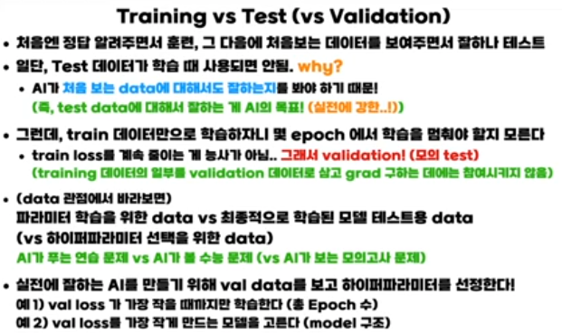 - Validation data: 학습에는 참여하지 않지만,