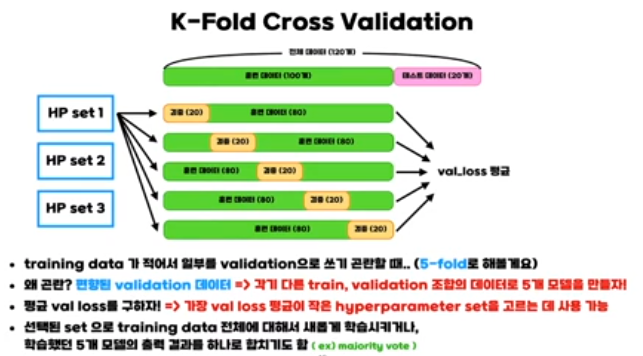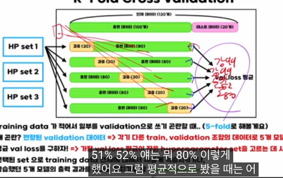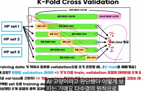 이 강의의 핵심은 “데이터가 적어서 밸리데이션 분할이 불안정할 때, K-fold 교차검증으로 ‘여러 가지 train/val 쪼개기’를 전부 돌린 뒤 평균 밸리데이션 성능을 쓰면 편향이 줄고, 하이퍼파라미터 선택도 더 믿을 만해진다”는 점입니다.