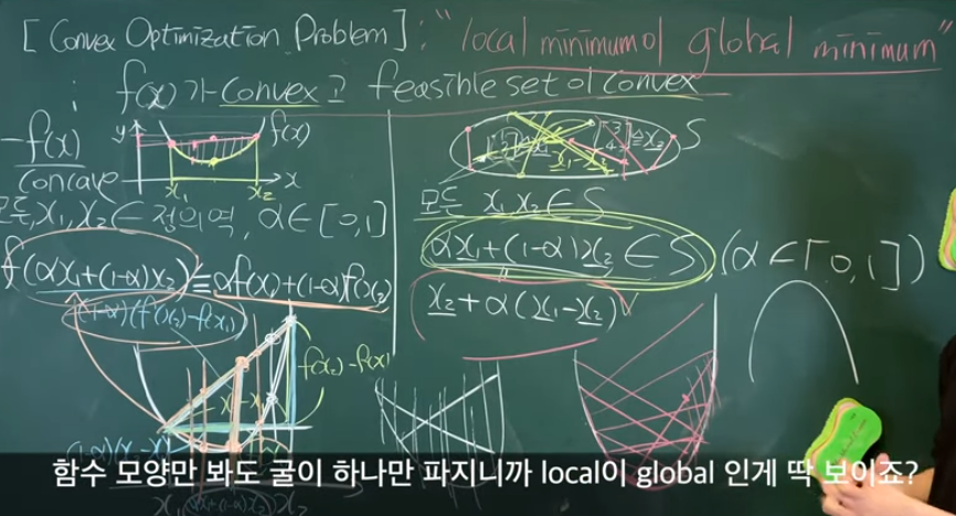 즉, “local minimum은 feasible solution들 중에서만 정의된다”는 점을 강조하면서, 컨벡스 문제 정의에 왜 ‘컨벡스 집합’이 같이 들어가는지도 자연스럽게 설명합니다.