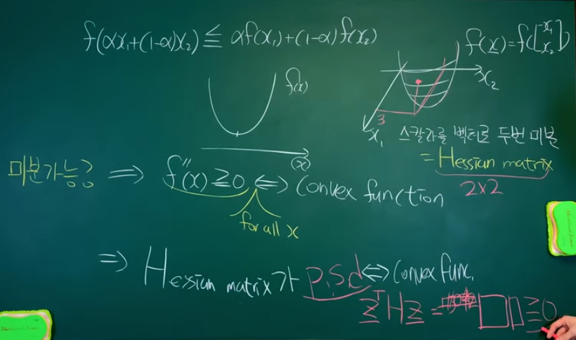 1변수 함수에서는 이게 곡선이 ‘위로 볼록한’ 모양과 연결되고, 다변수 함수에서는 2차형식과 헤시안이 양의 준정부호인지로 판별하는 방식과도 연결된다는 점을 언급합니다.