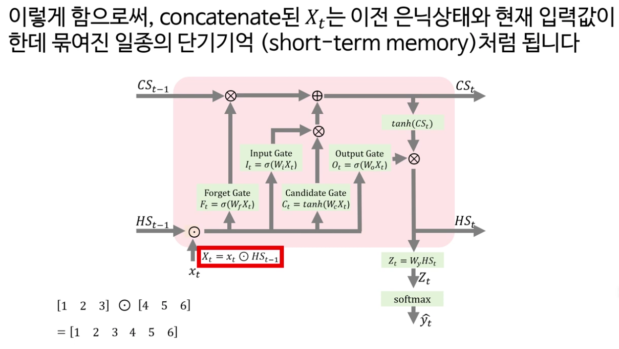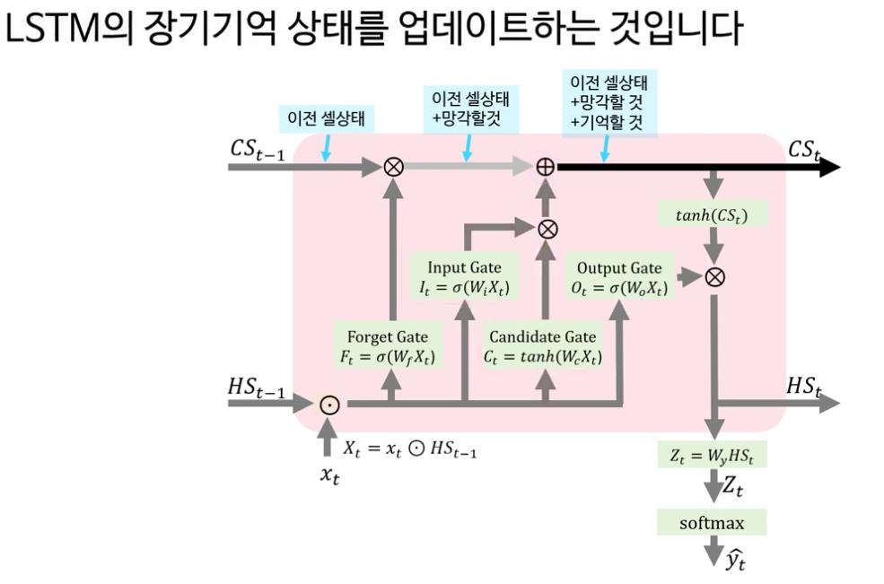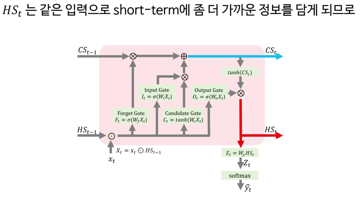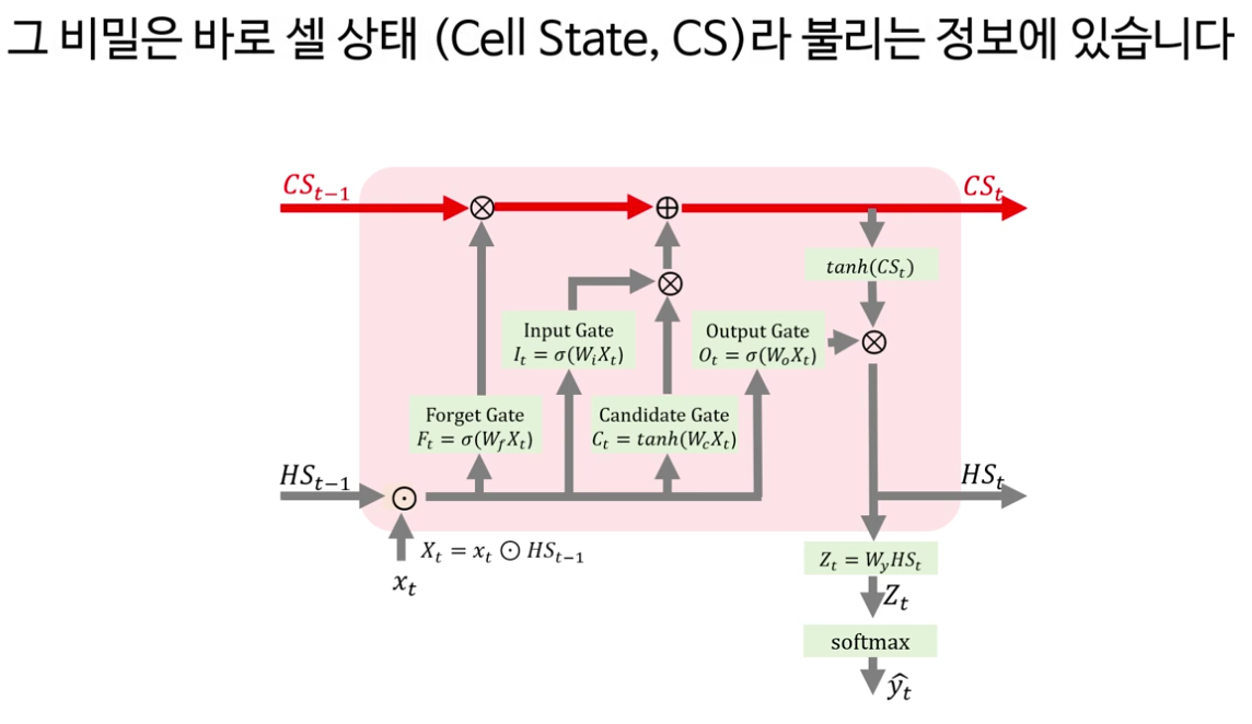 다음으로 강의는 LSTM의 핵심을 “셀 상태(cell state)와 네 개의 게이트”로 정리합니다. LSTM은 기본적으로 RNN처럼 시계열 데이터를 처리하지만, 내부에 장기 기억에 해당하는 셀 상태 C t 와 보다 단기적인 정보를 담는 은닉 상태 h t 두 흐름을 동시에 유지한다는 점이 강조됩니다.
