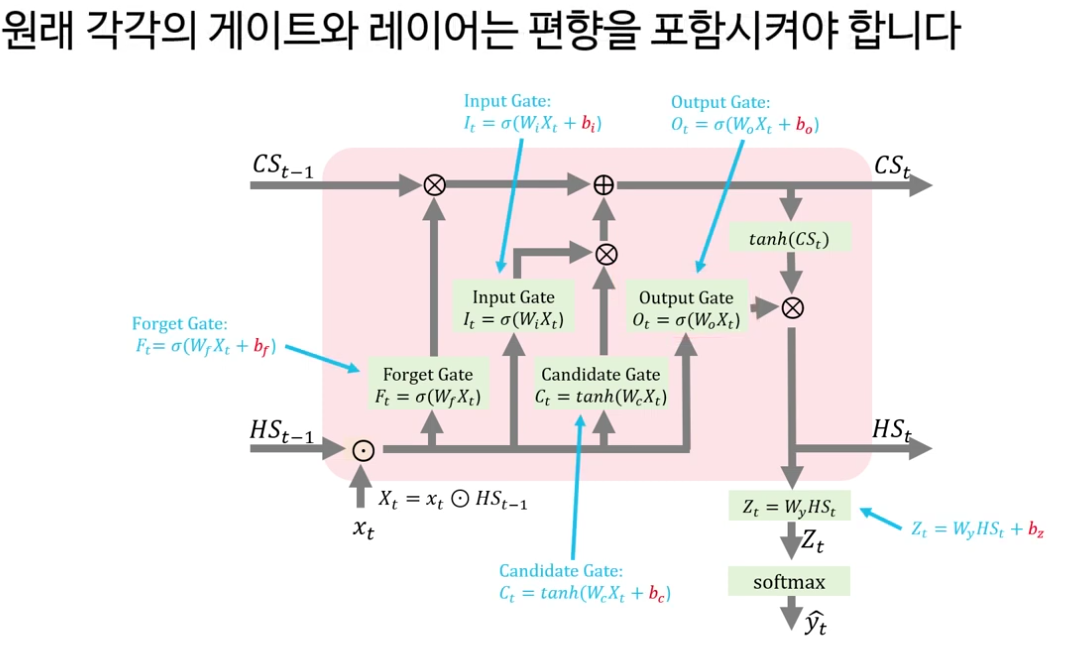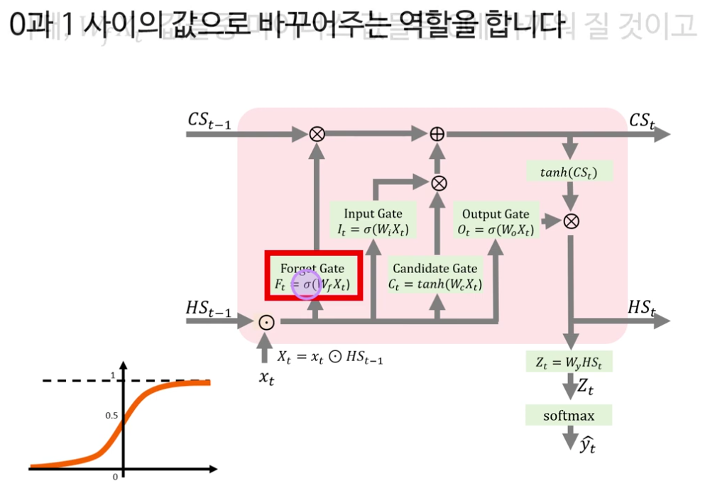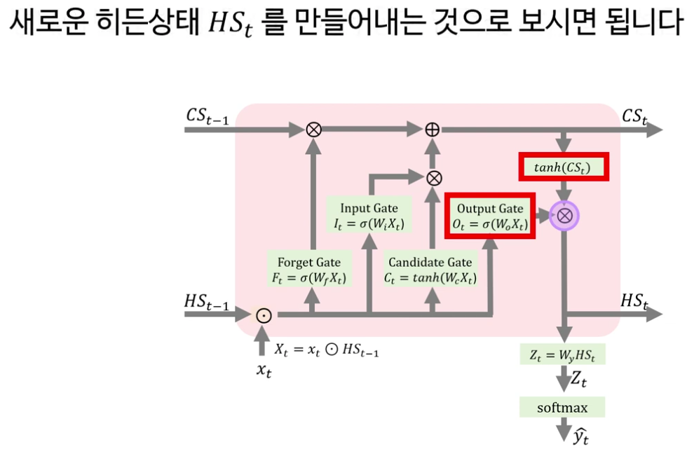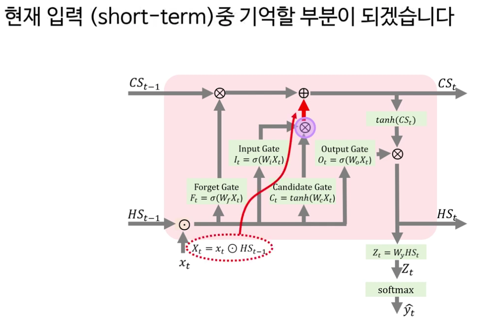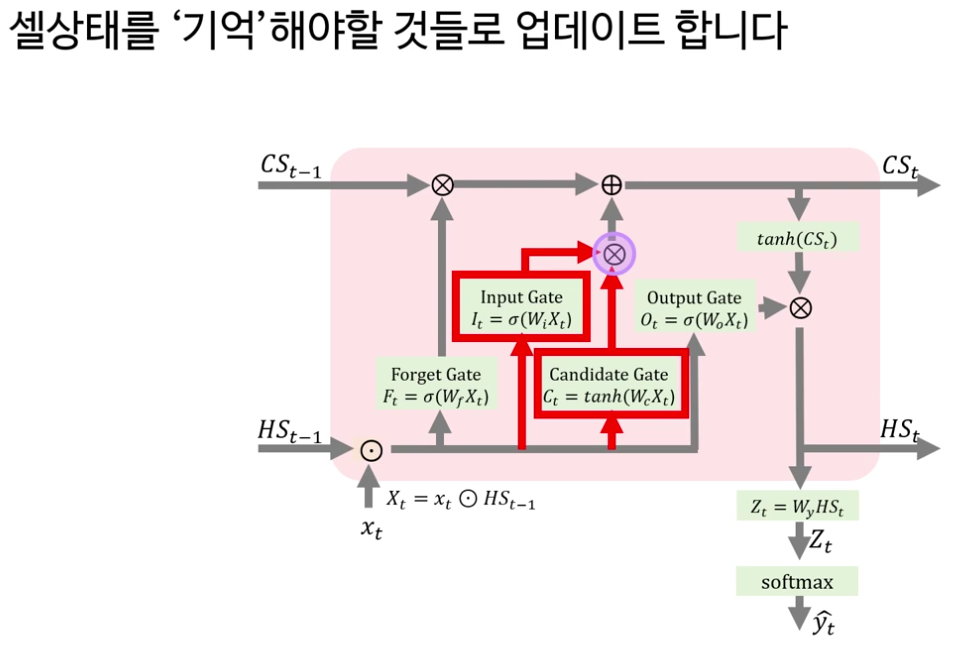 다음으로 강의는 LSTM의 핵심을 “셀 상태(cell state)와 네 개의 게이트”로 정리합니다. LSTM은 기본적으로 RNN처럼 시계열 데이터를 처리하지만, 내부에 장기 기억에 해당하는 셀 상태 C t 와 보다 단기적인 정보를 담는 은닉 상태 h t 두 흐름을 동시에 유지한다는 점이 강조됩니다.