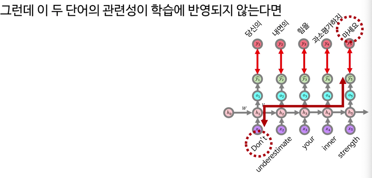 강의는 먼저 기본 RNN의 역전파 수식을 다시 꺼내와, 시간 축이 길어질수록 체인 룰로 곱해지는 항들이 1보다 작은 값이라면 기울기가 0에 가까워지는 현상을 보여 줍니다. 이로 인해 문장 번역에서 “Don’t … underestimate your inner strength” 같은 문장에서, 의미상 짝을 이루는 “Don’t–마세요”처럼 멀리 떨어진 단어들 사이의 의존성이 잘 학습되지 않는다는 예시를 듭니다.