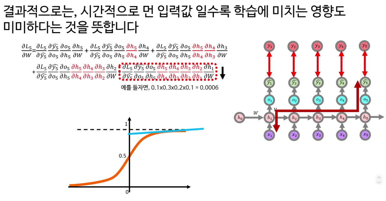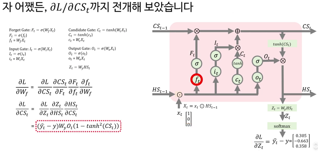 마지막 파트에서는 “왜 LSTM은 RNN보다 장기 의존성 문제가 덜 심한가?”라는 질문을, 기울기의 전달 구조를 통해 설명합니다. RNN의 경우 시간 축을 따라 1보다 작은 값들이 계속 곱해져 기울기가 급격히 0으로 수렴하는 반면, LSTM에서는 셀 상태와 은닉 상태의 기울기가 단순 곱셈만이 아니라 덧셈 형태로도 전달되기 때문에 완전히 0으로 가라앉기 어렵다는 점을 강조합니다.